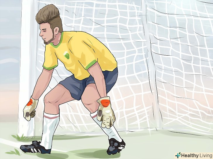 - Щоб налякати нападників на ворота гравців, станьте в широку позицію. Це ви можете зробити, якщо підніміть руки над головою або будете тримати їх в сторони. Це також психологічний трюк, який використовується для того, щоб нападник не був упевнений куди бити м'яч.