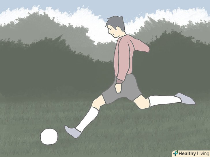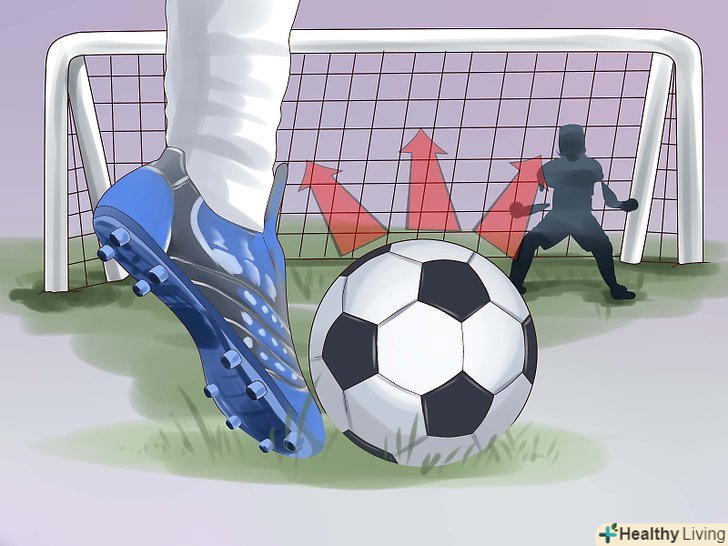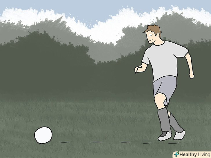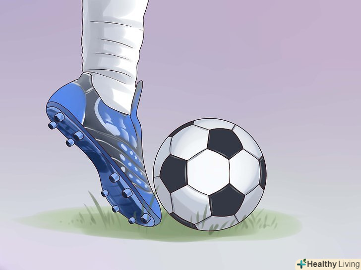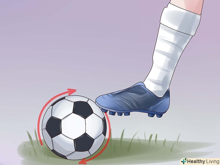 Вдарте м'яч по центру підйомом ноги – тією частиною, де проходить кістка від великого пальця ноги до рівня щиколотки. цільтеся потрапити в клапан м'яча, який ви направили на себе на початку.- Щоб запустити м'яч з ефектом ракети, вам необхідно запустити некрутящийся м'яч. Намагайтеся якомога рівніше потрапити в центр м'яча, ніяк не закручуючи його ногою.