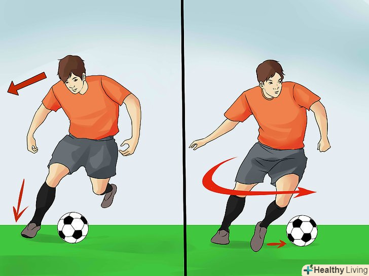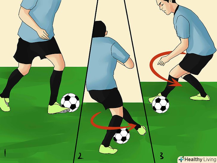 Застосовуйте під час матчу фінт Зіко. цей рух дозволяє обдурити захисника суперника і ефективно його обійти. Ведіть м'яч дриблінгом вперед на 3-6 м, щоб набрати швидкість. Поставте праву ногу праворуч від м'яча на відстані близько 30 см від нього. Потім підніміть ліву ногу і злегка штовхніть м'яч з правого боку зовнішнім краєм лівої стопи (обидві ноги тепер будуть праворуч від м'яча). [24] [25]- Продовжуйте контролювати м'яч лівою ногою, одночасно повертаючи тіло проти годинникової стрілки разом з правою ногою.