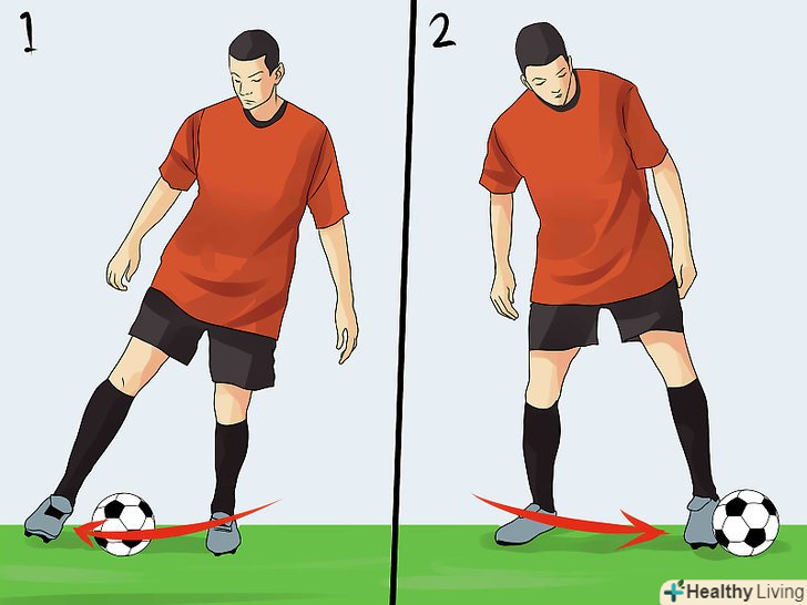 Освойте фінт "ножиці". за аналогією з розворотом Кройфа, даний фінт повинен змушувати противника зненацька. Щоб відпрацювати фінт, ведіть м'яч вперед приблизно на 6-9 м, набираючи швидкість і силу. Поставте ліву ногу зліва від м'яча на відстані близько 30 см.Розмахніться правою ногою, як ніби збираєтеся вдарити по м'ячу. Повертаючи праву ногу назад, обведіть її за годинниковою стрілкою навколо м'яча, не торкаючись до нього. [22] [23]- Завершивши дугу, поставте праву ногу праворуч від м'яча. Підніміть ліву ногу і штовхніть м'яч вліво.