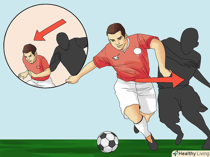 Вдавайтеся до фінту плечем в ході матчу. ймовірно, це найпростіше у виконанні рух, але при цьому приголомшливо дієве. Ведіть м'яч дриблінгом приблизно на 3-6 метрів вперед. Наблизившись до захисника суперника, схиліть плечі вліво, як ніби збираєтеся рухатися в цьому напрямку. Потім поверніть траєкторію м'яча на 45 градусів вправо шведкою правої ноги. [19]- Аналогічним чином можна діяти і в протилежному напрямку. Схиліть плечі вправо, а потім запустіть м'яч на 45 градусів вліво зовнішнім боком лівої стопи.
