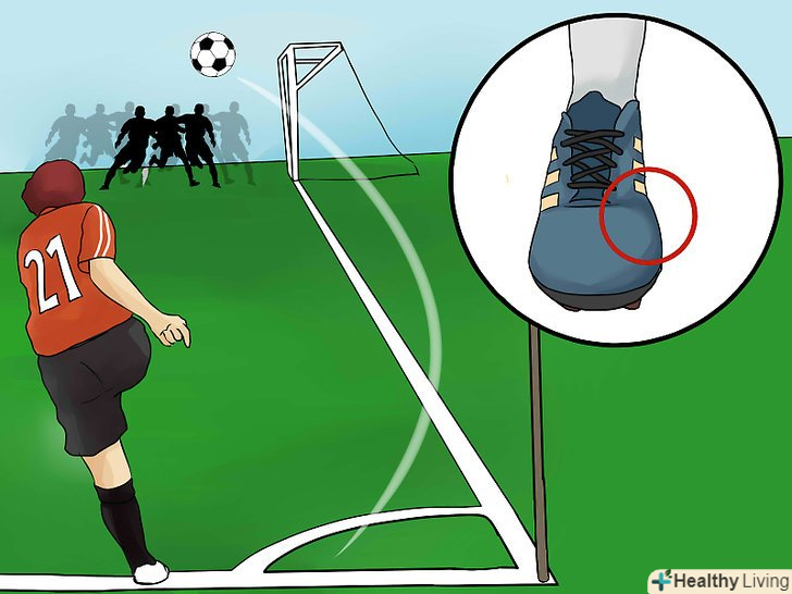 - Коли будете бити по м'ячу, робіть це верхньою частиною щічки правої стопи. Так ви збільшите дугу, по якій м'яч полетить до воріт.