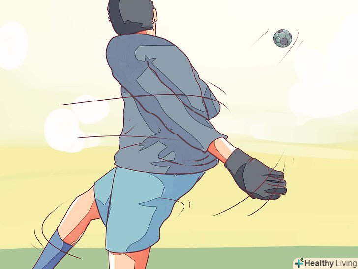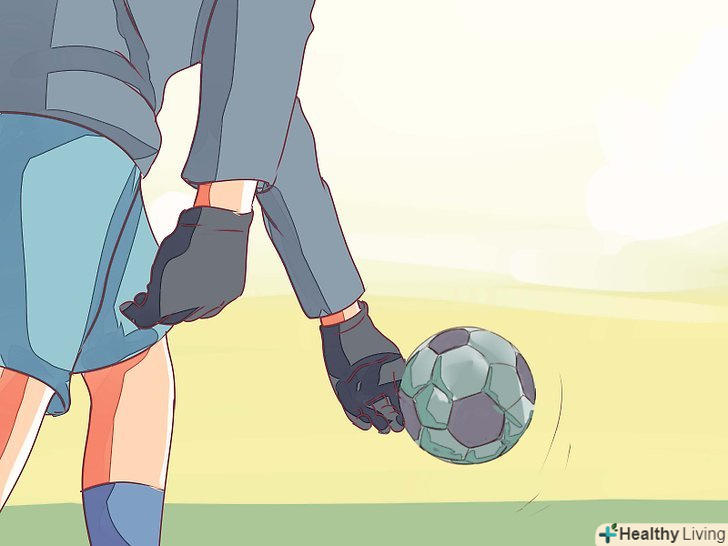 - Вибивання м'яча з рук відбувається досить швидко, тобто одночасно виконується кілька дій. Більшість воротарів тримають м'яч в одній руці, роблять кілька кроків, розпрямляють руку і підкидають м'яч одним плавним рухом. Тренуйте поєднання всіх цих дій в одне, зручне для вас. [1]