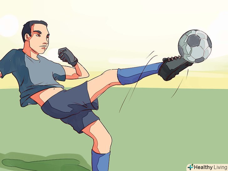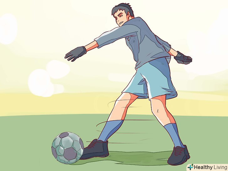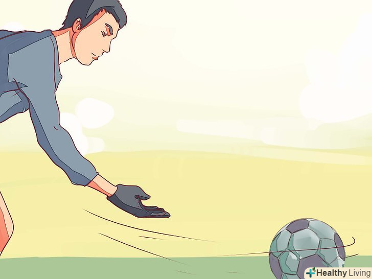 Завершення. після удару нога повинна просунутися вперед і вказувати точно в напрямку польоту м'яча, а ви трошки відірветеся від землі. Не потрібно підстрибувати, але тіло повинно завершити розпочате рух, щоб не перенапружити підколінні сухожилля і не травмуватися. Обережно опустіться на опорну ногу і негайно повертайтеся до прямих воротарських обов'язків.