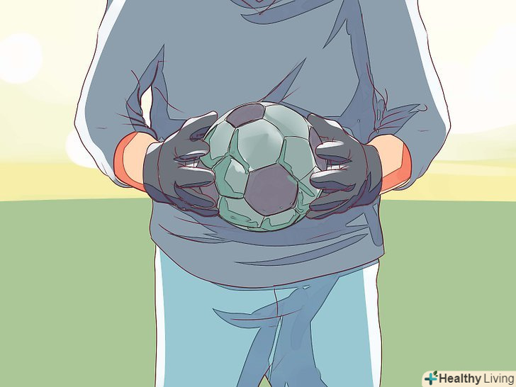 Утримуйте м'яч на рівні пояса. зловивши м'яч, м'яко утримуйте його обома руками приблизно на рівні пояса. Точність до міліметра не потрібно, але зазвичай найпростіше вибити м'яч з рук, підкинувши його з такої висоти. Руки повинні бути витягнутими, а м'яч слід тримати пальцями.- Багато воротарів граються з м'ячем перед вибиванням або тримають його однією рукою, але виконуючи кроки перед вибиванням, краще надійно тримати м'яч двома руками. Не потрібно грати на публіку. Просто тримайте м'яч.