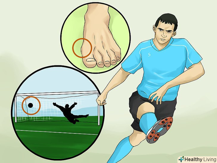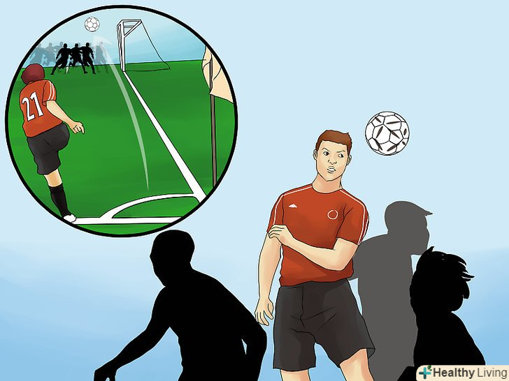 Забийте гол після кутового удару. кутовий удар призначається в тому випадку, якщо обороняється сторона вибила м'яч за лінію власних воріт. Це відмінний шанс подати м'яч у штрафний майданчик і забити швидкий гол. Зосередьтеся на розіграші кутового, взаємодіях з партнерами і техніці удару, щоб забити м'яч у ворота. [8] направте м'яч до дальньому кутку воротарського майданчика.- Нанесіть удар по нижній частині м'яча внутрішньою стороною стопи.