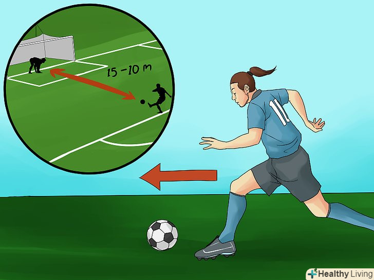 Постарайтеся наблизитися до воріт. незважаючи на спокусу завдати сильного удару з великої відстані, частіше взяттям воріт завершуються Удари з коротшої дистанції, оскільки вони більш точні і дозволяють відправити м'яч максимально незручно для воротаря. Наближайтеся до воріт, щоб частіше забивати голи. [5]- При цьому не потрібно занадто зближуватися з воротарем, оскільки воротарі вміють перекривати зони для удару і відбирати м'яч в ногах у нападників. Переконайтеся, що ви знаходитесь досить близько до воріт, але голкіпер не зможе дотягнутися до м'яча і «обікрасти» вас.