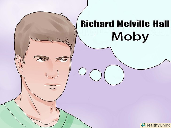 Використовуйте в якості псевдоніма ваше дитяче прізвисько.напевно в дитинстві вас називали якось ще, крім як по імені-І це цілком може стати пристойним псевдонімом. Наприклад, Річарда Мелвілла Холла батьки в дитинстві звали»Мобі". Хлопець виріс, тепер "Moby" - його сценічний псевдонім.[3]