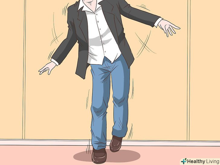 Спотикайтеся під час ходьби.артисти театру часто використовують такий трюк, коли підлога ніби починає рухатися під вами.[12] Не перегравайте і не падайте занадто часто, інакше ваша хитрість буде розкрита. Достатньо лише постійно похитуватися.- У нерухомому стані намагайтеся притулятися до стін, щоб посилити ефект.