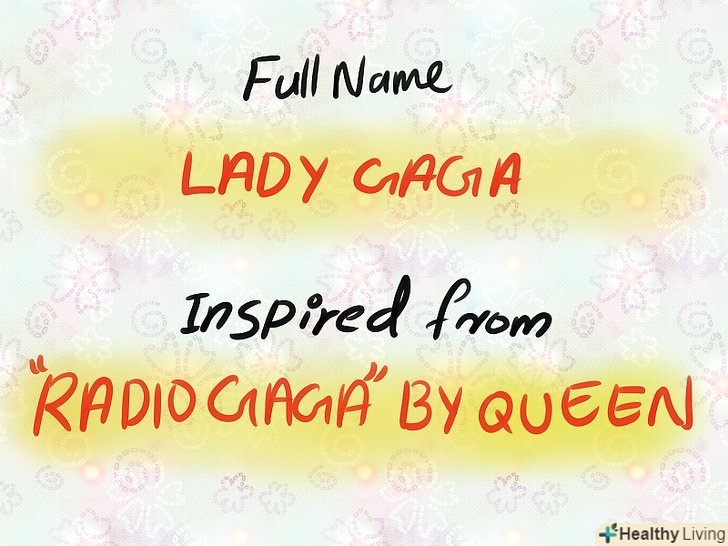 Подумайте, які люди і предмети роблять на вас вплив.багато людей вибирають сценічне ім'я, яке відображає те, що їх надихає. Як краще засвідчити свою повагу конкретній людині або віддати належне певній традиції? Кілька прикладів:- Наприклад, Кейсі Рамон з групи Vivian Girls надихнулася на використання свого прізвища "Рамоне". Цієї ж традиції послідувала вся група.