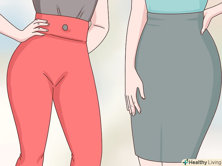 Придбайте штани та спідниці із завищеною талією.речі із завищеною талією підкреслюють фігуру Кім, тому вони теж є базою її гардеробу. Підшукуючи собі джинси, брюки та спідниці, постарайтеся знайти моделі із завищеною талією, як у Кім.[4]- Поєднуйте речі із завищеною талією з білими блузками і нейтрально бежевою взуттям.