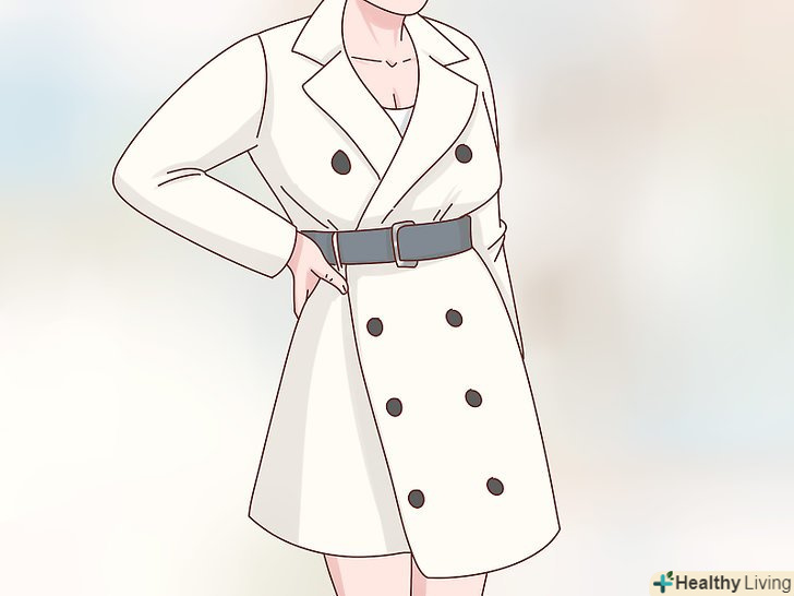 Купіть собі плащ.звичайний плащ-одна з найважливіших речей в гардеробі Кім. Плащі відносяться до найпростіших базових речей, які поєднуються практично з чим завгодно. Кім носить плащі навіть поверх суконь, роблячи в своєму вбранні акцент саме на них.[8]- Доповніть плащ парою туфель на шпильці і розкішною дамською сумочкою.