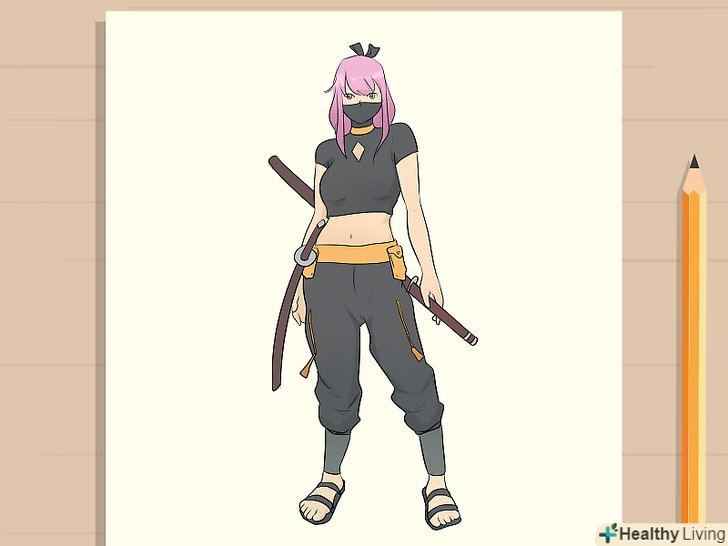 Використовуйте підказки щодо дизайну з опису особистості та історії персонажа. Додайте одяг та аксесуари. Ваш вибір повинен підкреслити особистість і історію персонажа. Наприклад, якщо ваш персонаж — дівчина, яка любить у всьому практичність, — зображуйте її в зручному взутті на суцільній підошві, а не на підборах. Якщо ви хочете підкреслити минуле вашого героя-придумайте річ, яку він буде носити на собі або з собою як нагадування про щось важливе. Наприклад, в» Легенді про Корре " Мако постійно носить хустку своєї матері. Будьте креативні!