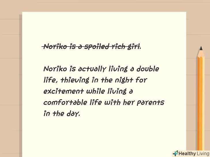 Слідкуйте за балансом рис характеру персонажа.також важливо, щоб особисті якості вашого героя були збалансованими. Для створення переконливого, правдоподібного образу потрібен баланс позитивних і негативних якостей. Порахуйте погані і хороші риси вашого персонажа і постарайтеся зробити так, щоб негативних якостей було менше. В кінці вашої історії герой повинен розвинутися і позбутися від парочки поганих якостей. Приклади негативних рис характеру:- Маніпулятор;
