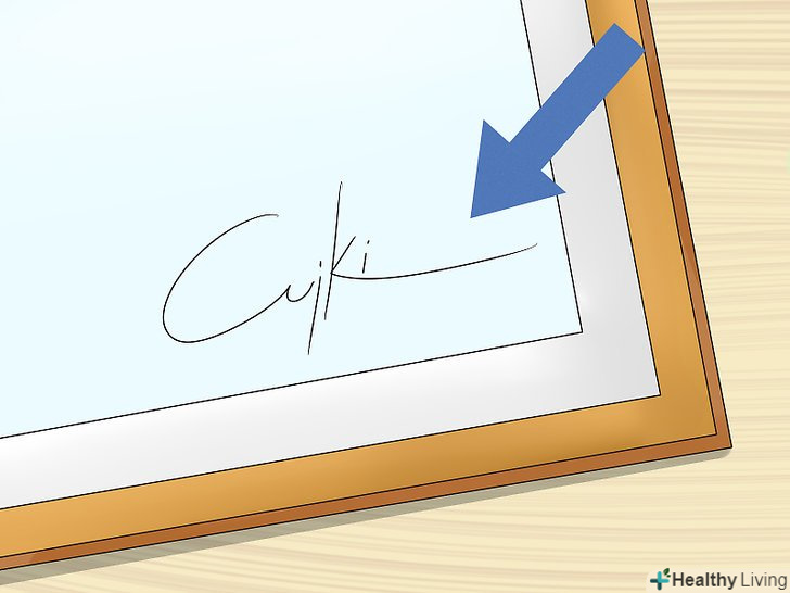 Пошукайте на полотні особистий підпис художника.часто найпростіший спосіб визначити справжність картини-це знайти на її лицьовій або зворотній стороні полотна підпис художника. Зокрема, зверніть увагу, чи нанесена підпис вручну і чи використовувалася для цього фарба. Якщо на картині немає підпису або підпис виглядає плоскою і занадто рівною, великі шанси, що це копія або підробка.[9]- Якщо вам відомо ім'я автора картини, пошукайте його роботи в Інтернеті і порівняйте підпис на представлених там роботах з підписом на цікавить Вас картині.