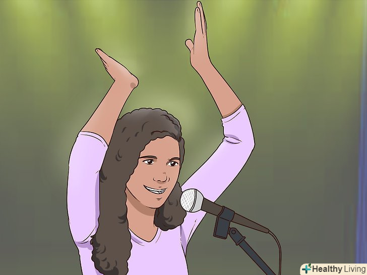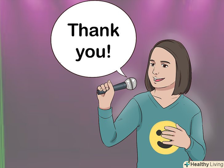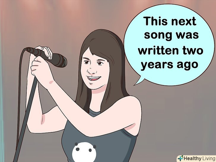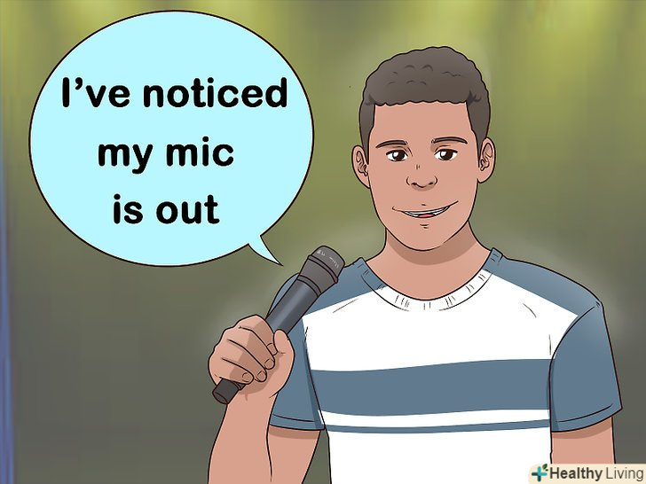 Ігноруйте помилки.якщо ви випадково забули рядок пісні або переплутали ноту, продовжуйте співати. Якщо глядачі помітять неточність, вони можуть прийняти її за імпровізацію. Крім того, не слід привертати увагу до помилок інших музикантів. Якщо один з інструментів засмучений або стався інший критичний недолік, то розрядите обстановку жартом.[10]- Наприклад, можна сказати слухачам: "здається, мій мікрофон фонить. Давайте насолодимося музикою, поки техніки будуть вирішувати проблему".