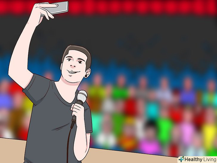 Робіть фото і записуйте відео для публікації в соціальних мережах.слухачі напевно будуть фотографувати групу, так чому б не фотографувати присутніх. У перервах між піснями поверніться спиною до залу і зробіть селфі з глядачами для Instagram. Також можна записати короткий ролик, коли глядачі будуть підспівувати.- Заздалегідь попереджайте присутніх про фото або відео: «я хочу записати короткий ролик, на якому ми будемо співати всі разом. Давайте пошумимо"»