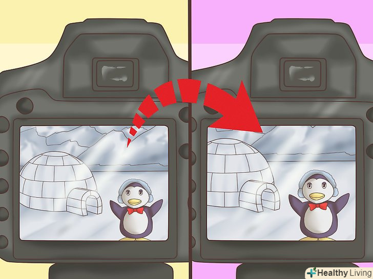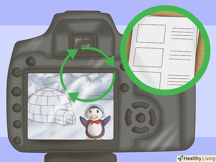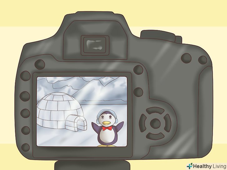 Зніміть перший кадр.коли перша сцена буде остаточно виставлена, можна зняти перший кадр мультфільму! Натисніть на кнопку спуску затвора камери. Перевірте отримане зображення і переконайтеся в тому, що воно виглядає саме так, як ви задумали, включаючи освітлення, положення фігурок та інших предметів в кадрі.[10]- Вся сцена мультфільму повинна бути добре освітленою, але при цьому вона повинна імітувати ту ситуацію, яку ви відтворюєте. Тому, якщо ви знімаєте вуличну сцену, виберіть місце розташування сонця на небі і встановіть там підсвічування. Так у вас в кадрі вийдуть реалістичні тіні.