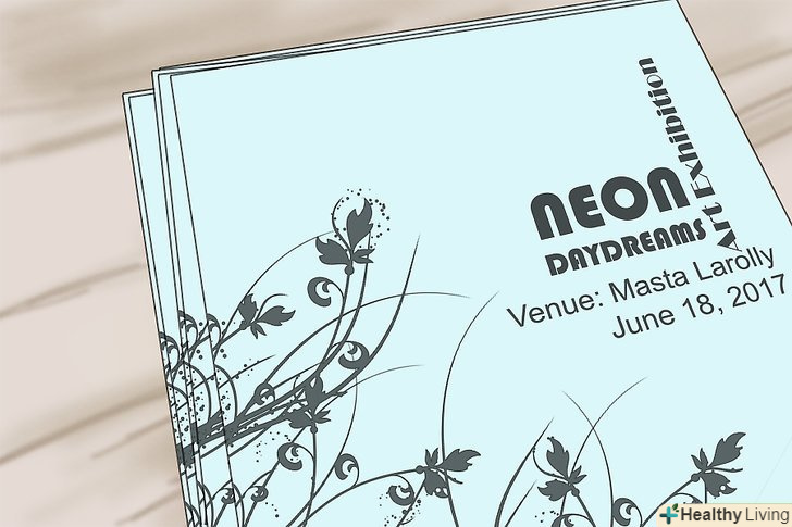 Створіть рекламні матеріали.надрукуйте плакати, листівки, брошури та інформаційні оголошення на одну сторінку, які б коротко описували суть виставки і те, які художні твори на ній можна побачити. Переконайтеся, що всюди вказані ключові деталі, такі як дата і час, місце проведення, дрес-код і вартість вхідного квитка (при необхідності). Якщо ваша виставка-Захід високого класу, то, можливо, варто зробити Прес-реліз або розмістити інтерв'ю в місцевих новинних виданнях.[13]- Помістіть вашу рекламу в громадських місцях, наприклад, місцевому університеті або школі, кав'ярнях, клубах або навіть на громадській дошці оголошень біля супермаркету.