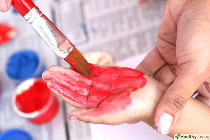 Покрийте кисть вашої дитини фарбою або гіпсом, щоб зробити відбиток.замість того щоб занурювати всю руку в миску з фарбою або гіпсом, нанесіть за допомогою кисті. Розподіліть фарбу або штукатурку рівномірно по всій долоні. Покрийте кисть вашої дитини фарбою або гіпсом, щоб зробити відбиток.замість того щоб занурювати всю руку в миску з фарбою або гіпсом, нанесіть за допомогою кисті. Розподіліть фарбу або штукатурку рівномірно по всій долоні.