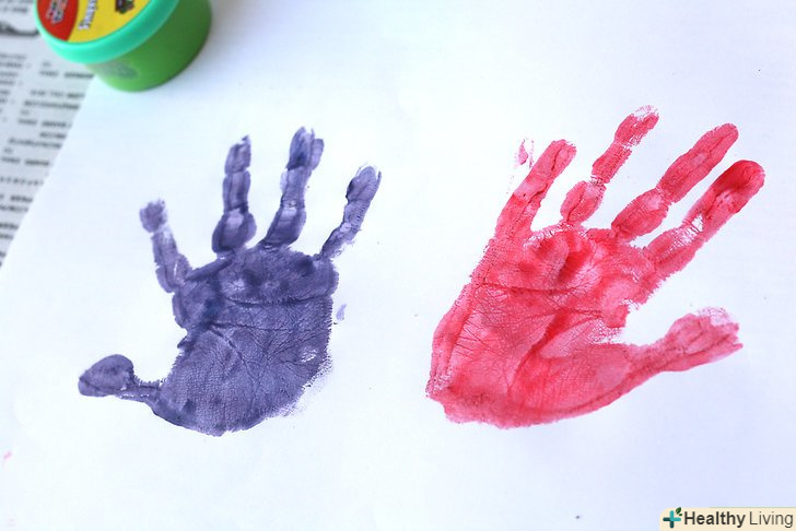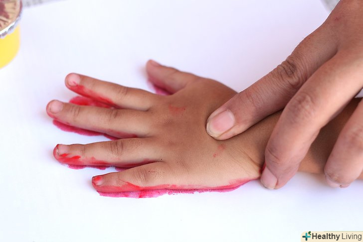 Направляйте руку вашої дитини на полотно, папір або картон.обережно натисніть НЕ його руку, щоб переконатися, що ви дійсно зробили відбиток руки. Скажіть дитині, що ручку треба потримати (якщо він або вона ще не розуміє цього), а потім обережно підніміть руку. Направляйте руку вашої дитини на полотно, папір або картон.обережно натисніть НЕ його руку, щоб переконатися, що ви дійсно зробили відбиток руки. Скажіть дитині, що ручку треба потримати (якщо він або вона ще не розуміє цього), а потім обережно підніміть руку.