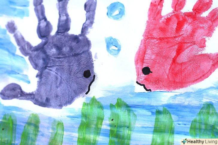 Прикрасьте відбиток руки, використовуючи вам дизайн.якщо ви все ще чекаєте, поки воно висохне, прокрутіть в голові що ж Ви все-таки хочете зробити з відбитком вашої дитини. Ось вам список можливих ідей: Прикрасьте відбиток руки, використовуючи вам дизайн.якщо ви все ще чекаєте, поки воно висохне, прокрутіть в голові що ж Ви все-таки хочете зробити з відбитком вашої дитини. Ось вам список можливих ідей:- Використовуйте маркер, щоб домалювати обличчя, крила, плавники, руки, ноги і т.д., так ви створите істот з відбитків долоньок. Додайте пейзаж.