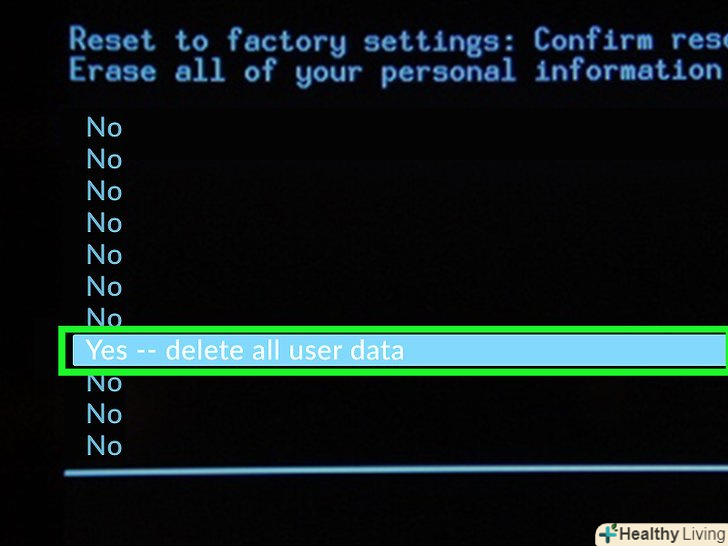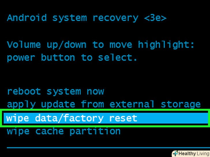 ВиберітьСтерти дані і скинути налаштування. кілька разів натисніть на кнопку зменшення гучності, щоб вибрати цю опцію (зазвичай потрібно натиснути чотири рази).