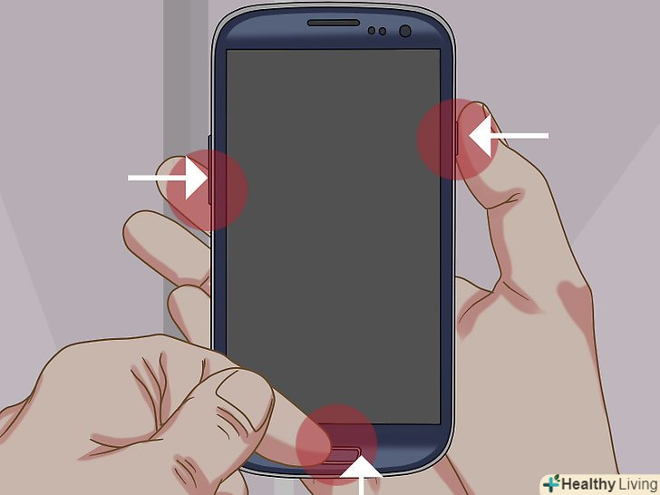 Натисніть і утримуйте кнопку живлення, кнопку збільшення гучності і кнопку блокування.зробіть це відразу після того, як натиснете «перезавантажити»; не відпускайте ці кнопки, поки не перейдете на екран відновлення — на ньому відобразиться білий логотип Android на світло-блакитному тлі.- Кнопка блокування знаходиться на лівій панелі Galaxy.