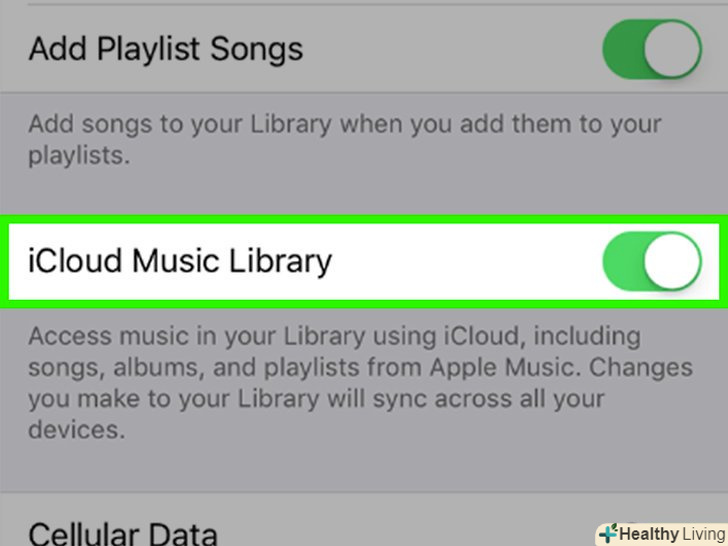 Пересуньте повзунок "Медіатека iCloud «в положення»включити". повзунок знаходиться в середній частині меню.- Пересуньте повзунокПередача даних в положення "включити «(зелений колір) або» вимкнути" (сірий колір), щоб включити або вимкнути передачу файлів через стільникову мережу.