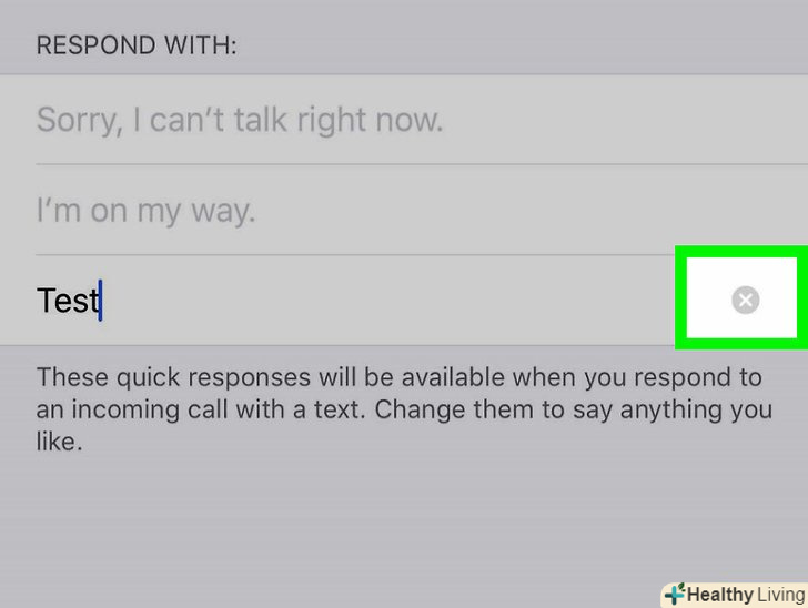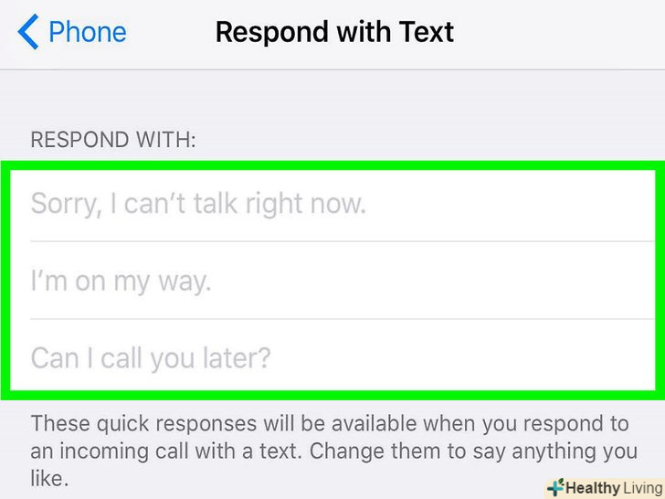 Виберіть одне з готових повідомлень.на екрані відобразяться три готових повідомлення. Торкніться потрібного повідомлення, щоб відхилити дзвінок і відправити повідомлення.- Якщо ви хочете змінити готові повідомлення, перейдіть до наступного розділу.