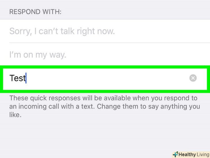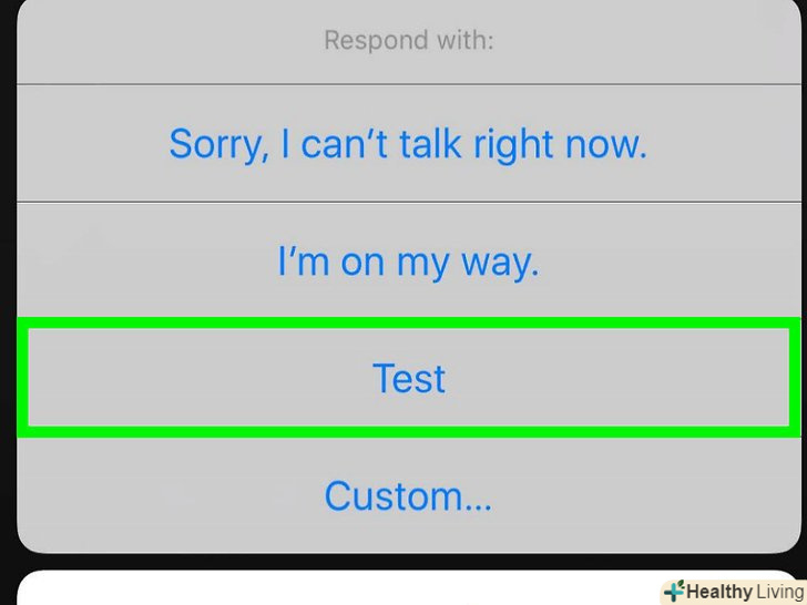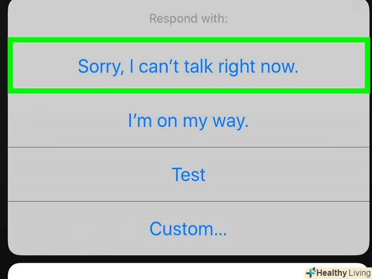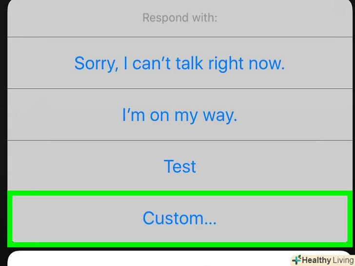 Виберіть нове повідомлення при відповіді на дзвінок.тепер, коли смартфон буде дзвонити, на екрані будуть відображатися не готові, а ваші повідомлення. Натисніть на одне з них, щоб відхилити виклик і відправити повідомлення.[1]