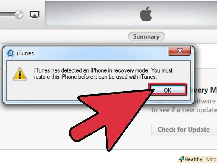 - Тримайте кнопку Home, але відпустіть кнопку Power. Тримайте кнопку Home до тих пір, поки в iTunes не з'явиться повідомлення про виявлення нового пристрою в режимі відновлення.