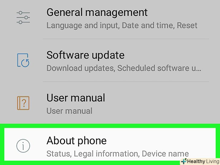 Прокрутіть вниз і натиснітьПро смартфон.ця опція знаходиться внизу сторінки налаштувань.[1] Прокрутіть вниз і натиснітьПро смартфон.ця опція знаходиться внизу сторінки налаштувань.[1]
