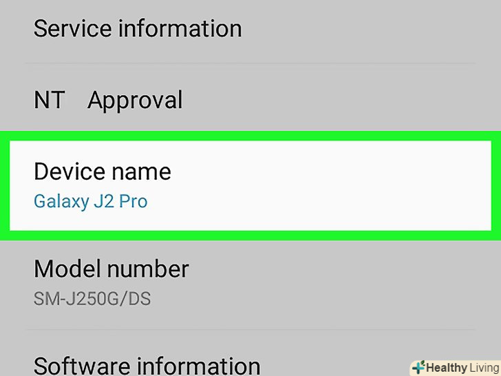 Знайдіть і натисніть на поточне ім'я пристрою.ви знайдете його на сторінці "про смартфон" (точне розташування імені залежить від моделі пристрою). Знайдіть і натисніть на поточне ім'я пристрою.ви знайдете його на сторінці "про смартфон" (точне розташування імені залежить від моделі пристрою).- На деяких пристроях потрібно натиснути "Ім'я пристрою" на цій сторінці.