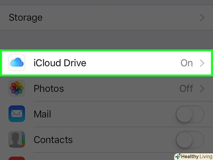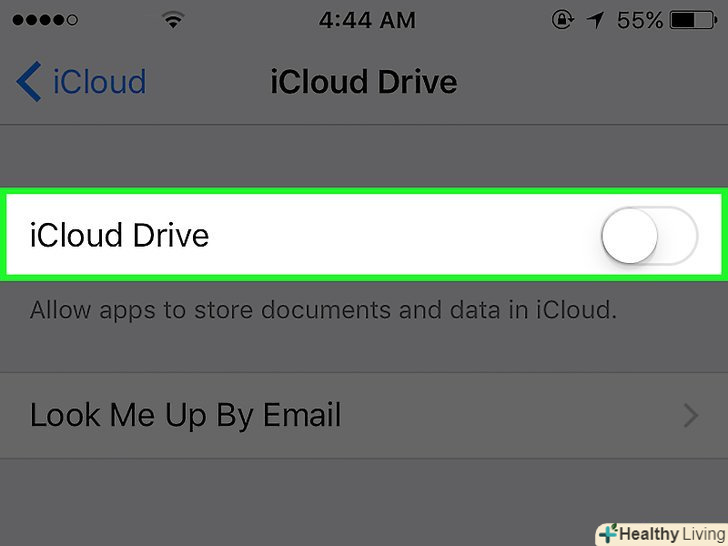 Пересуньте перемикач уICloud Drive вліво в положення «вимкнути».він забарвиться в сірий колір-це означає, що функція "iCloud Drive" відключена. Пересуньте перемикач уICloud Drive вліво в положення «вимкнути».він забарвиться в сірий колір-це означає, що функція "iCloud Drive" відключена.- Як тільки ви відключите функцію "iCloud Drive", однойменне додаток зникне з головного екрана.