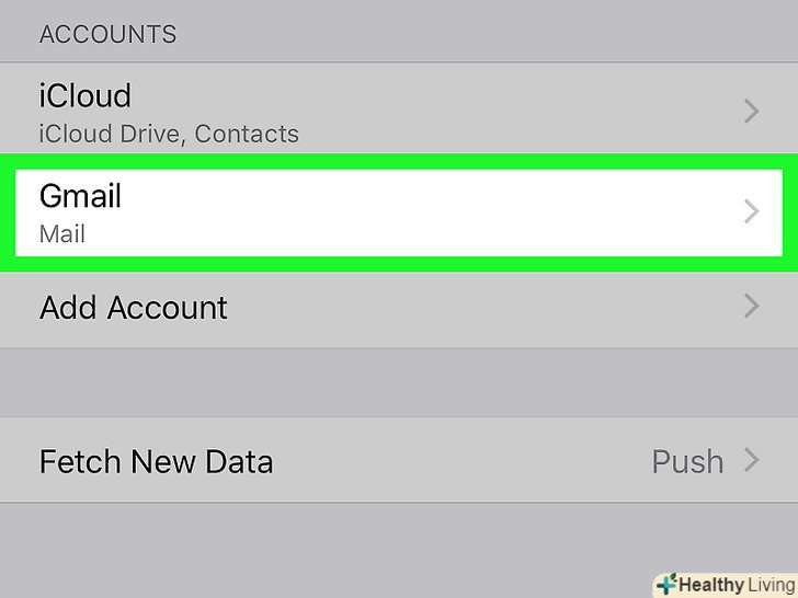 Виберіть обліковий запис.у розділі "Облікові записи" торкніться облікового запису електронної пошти (наприклад, "Gmail"), який потрібно видалити з iPhone. Виберіть обліковий запис.у розділі "Облікові записи" торкніться облікового запису електронної пошти (наприклад, "Gmail"), який потрібно видалити з iPhone.