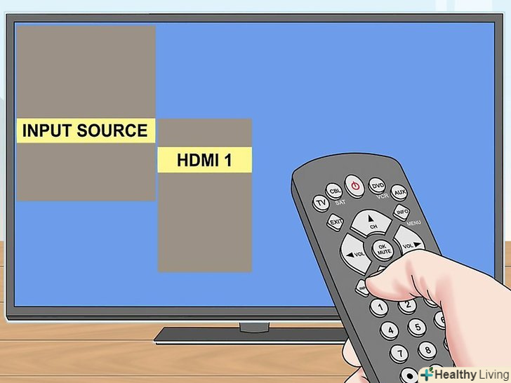 Налаштуйтеся на сигнал з HDMI-порту.змініть поточний відеовхід, щоб відобразити сигнал з HDMI-порту. Щоб дізнатися номер відеовходу HDMI, подивіться на число у роз'єму телевізора, до якого підключений HDMI-кабель. Як тільки ви налаштуєтеся на сигнал з HDMI-порту, на екрані телевізора відобразиться картинка з Samsung Galaxy. Налаштуйтеся на сигнал з HDMI-порту.змініть поточний відеовхід, щоб відобразити сигнал з HDMI-порту. Щоб дізнатися номер відеовходу HDMI, подивіться на число у роз'єму телевізора, до якого підключений HDMI-кабель. Як тільки ви налаштуєтеся на сигнал з HDMI-порту, на екрані телевізора відобразиться картинка з Samsung Galaxy.- Процес зміни відеовходу залежить від моделі телевізора. У більшості випадків потрібно просто натиснути "Input" (вхідний сигнал) на пульті або телевізорі.