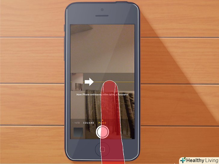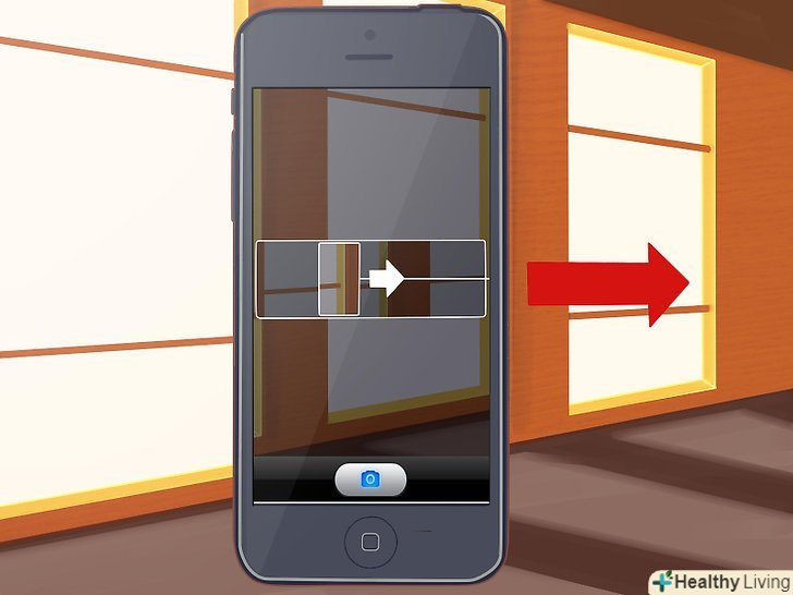 Почніть зйомку.торкніться кнопки із зображенням фотографічного затвора і почніть робити панорамну зйомку. Повільно рухайте камеру горизонтально, уздовж позначки на екрані. Тримайте телефон рівно і міцно, весь час на одному рівні.[1] Почніть зйомку.торкніться кнопки із зображенням фотографічного затвора і почніть робити панорамну зйомку. Повільно рухайте камеру горизонтально, уздовж позначки на екрані. Тримайте телефон рівно і міцно, весь час на одному рівні.[1]- Ви можете рухатися до тих пір, поки дозволяє вільне місце, а можете зупинитися в будь-який момент, натиснувши на зображення фотографічного затвора.