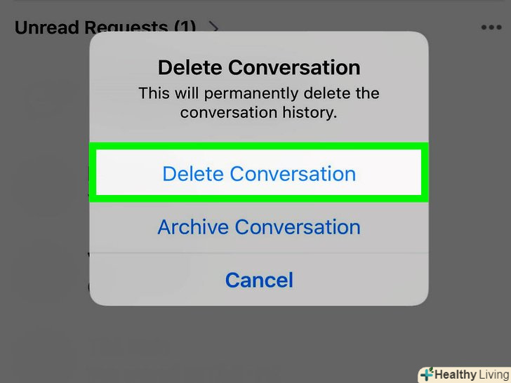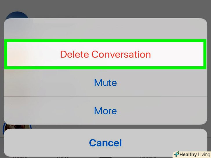 ТоркнітьсяВидалити листування.ця опція знаходиться в меню. ТоркнітьсяВидалити листування.ця опція знаходиться в меню.- На Android-пристроїв натисніть "Видалити".
