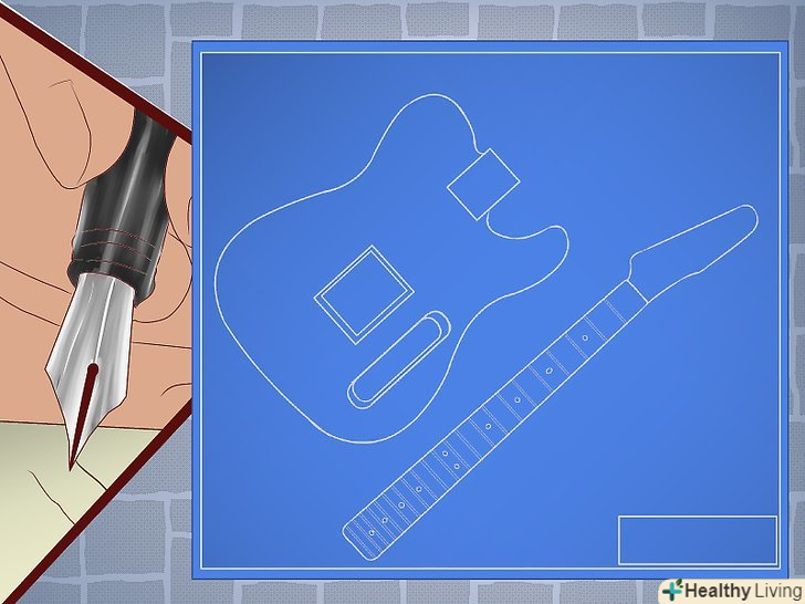 Зробіть креслення.все, що ви будуєте, будь-то будинок або LEGO-машинка, потребує кресленні. Щоб зробити це, дуже акуратно намалюйте гітару, яку ви хочете. Не пишіть на цьому аркуші нічого-пізніше це буде вам заважати. Вкажіть тільки необхідні розміри, а всі інші позначки робіть на іншому аркуші. Ви також можете роздрукувати фотографію гітари в натуральному розмірі, і потім перенести контури за допомогою підсвіченої поверхні або листа скла.