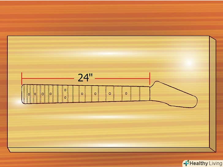 Купіть або зробіть гриф.купити готовий гриф найлегше, але якщо ви робите гітару самі, вам потрібно буде зробити і гриф. Це не дуже складно, досить знайти дерев'яний блок потрібної довжини (зазвичай довжина грифа становить близько 24 дюймів/61 см, плюс-мінус пару сантиметрів). Якщо ви робите гриф самі, вам потрібно буде зробити ладові поріжки з ладової дроту, яку можна купити в багатьох місцях. Процес установки ладових поріжків досить трудомісткий, і вимагає акуратності і терпіння. Для кожного лада потрібна окрема виїмка, і вона повинна бути скрізь однаковою. Якщо виїмки будуть різними, гриф буде постійно дзвеніти на різних ладах: це нікому не сподобається, і в першу чергу вам.