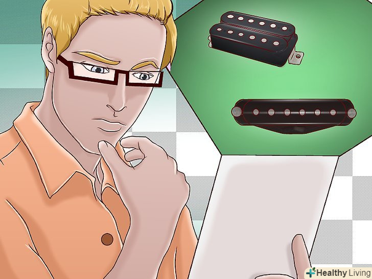 Виберіть Звукознімачі.Звукознімачі генерують магнітне поле і вловлюють вібрацію струн. Без звукознімачів, ваша гітара не зможе працювати з підсилювачем. Вам також потрібно буде визначити послідовність, в якій ви розмістите Звукознімачі. Це все залежить від вашого бюджету. Ось деякі приклади:- SSS, SSH, HSH, HH, H, HHH, SS, Or HS