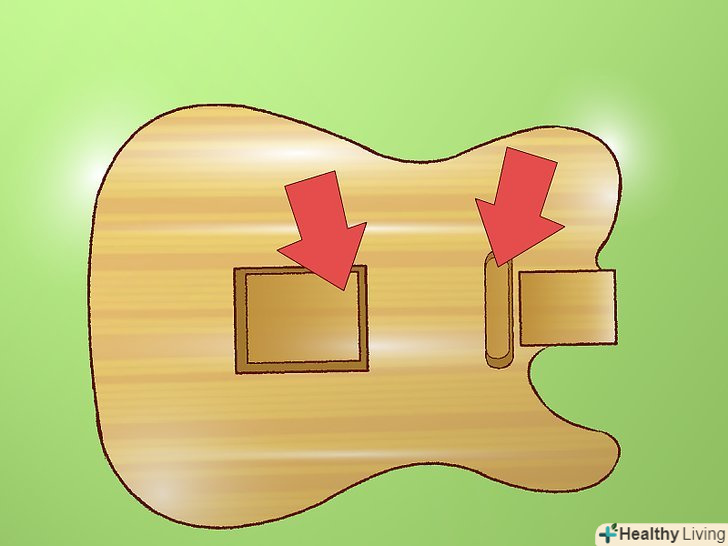 Виріжте порожнини для звукознімачів. є два види ходів: верхній хід використовується для прокладки проводів у верхній частині корпусу, і регулятори доступні зверху (як в Fender Stratocaster); нижній хід використовується для прокладки проводів в задню порожнину гітари (як в Gibson Les Paul). Зробіть порожнини потрібної глибини для кожного звукознімача, і зробіть отвори між порожнинами для проводів до регуляторів і інших звукознімачів.