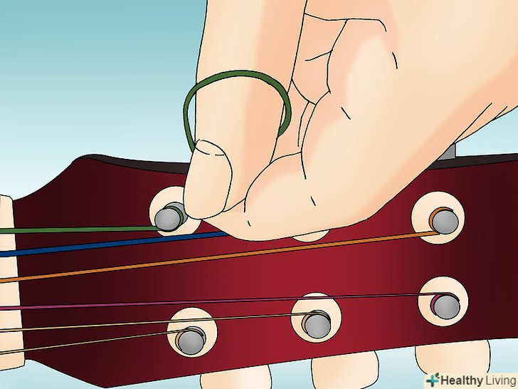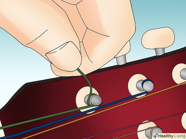 Протягніть кінець струни в отвір стрижня кілка, почніть обертати струну навколо стрижня, повертаючи колок проти годинникової стрілки.