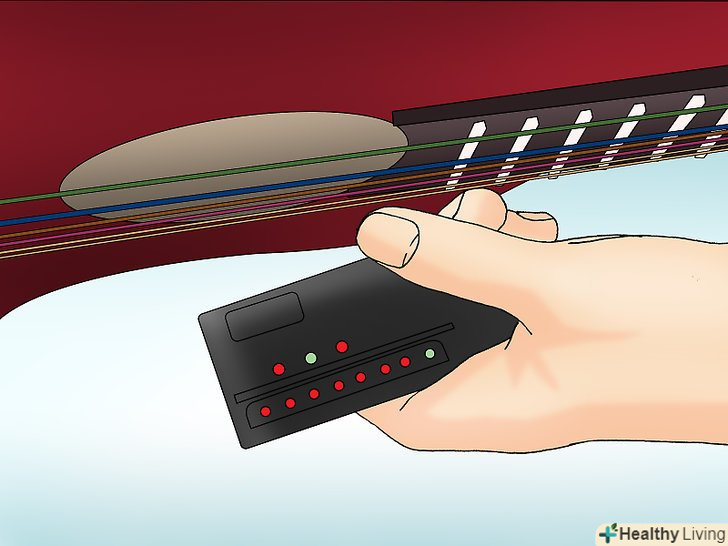 Дістаньте тюнер для акустичної гітари, візьміть гітару в руки.тримаючи тюнер на коліні, налаштуйте струну по тюнеру.