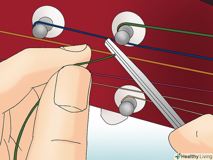 Знайдіть кульку (колечко) на кінці струни, вставте його в отвір фіксатора.Засуньте його всередину на 3-5 см, і встановіть зверху фіксатор. Трохи витягаючи струну на себе, одночасно вдавлюйте фіксатор, поки кулька не встане на місце. Як тільки він встане, втисніть фіксатор до кінця. Встановіть струну у відповідну канавку поріжка.