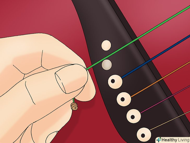 Зніміть витки зі стрижня кілка, вивільніть кінець струни з отвору.- Тепер струна повинна звисати з підструнника гітари. Підструнником називають місце кріплення струн до гітари, він знаходиться за резонаторним отвором.