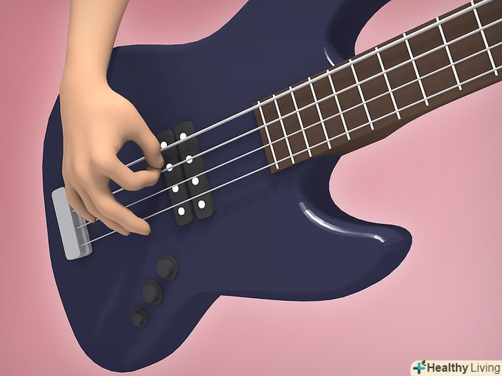 Правильна форма-це все.Навчіться використовувати вказівний і середній пальці, щоб защипувати струни бас-гітари. На басі немає ударів вгору і вниз (якщо не використовується медіатор), кожна нота, яку ви граєте, буде витягуватися за допомогою пальця, защипує струну у напрямку до вашого обличчя. Або ви можете грати рукою, як медіатором, скласти великий і вказівний палець разом і бринькати.
