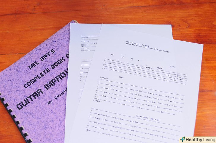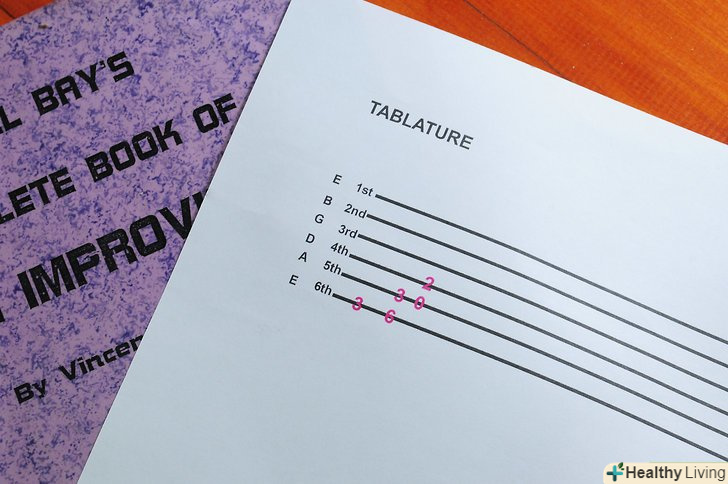 Навчіться розуміти табулатуру, або»таби".Табулатура-система запису нот за допомогою цифр, розміщених на грифі. Запам'ятайте, що перша струна табулатури-це нижня струна гітари, а шоста струна табулатури — верхня струна гітари.- Лінії-це струни.