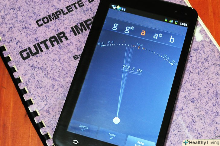 Налаштуйте гітару.якщо ви не вмієте налаштовувати гітару, то купите тюнер. Всі ними користуються, тому що новачкові дуже важко налаштувати гітару на слух. Якщо у вас немає тюнера, то візьміть камертон або що-небудь, на що можна орієнтуватися.- Налаштуйте відкриту п'яту струну на ноту A.